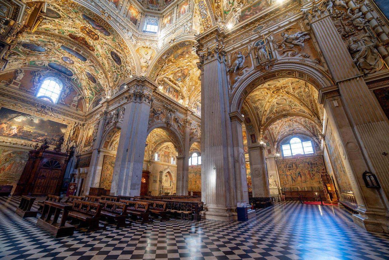 The Basilica was built in 1133 as a result of a vow made by the people of Bergamo to the Virgin Mary that if she protected the population from the plague epidemic, as a sign of gratitude, they would have dedicated a church to her. Although the Basilica lacks a central entrance and facade, its interior, partly frescoed and rich in stucco, tapestries and wooden marquetry, makes it very beautiful and fascinating. Between the two portals on the north side, the ancient commercial measures in use in Bergamo in the Middle Ages are fixed on the wall: the Capitium Comunis Pergami (rod) and the Brachium (arm’s length), used as a reference point by weavers and merchants.