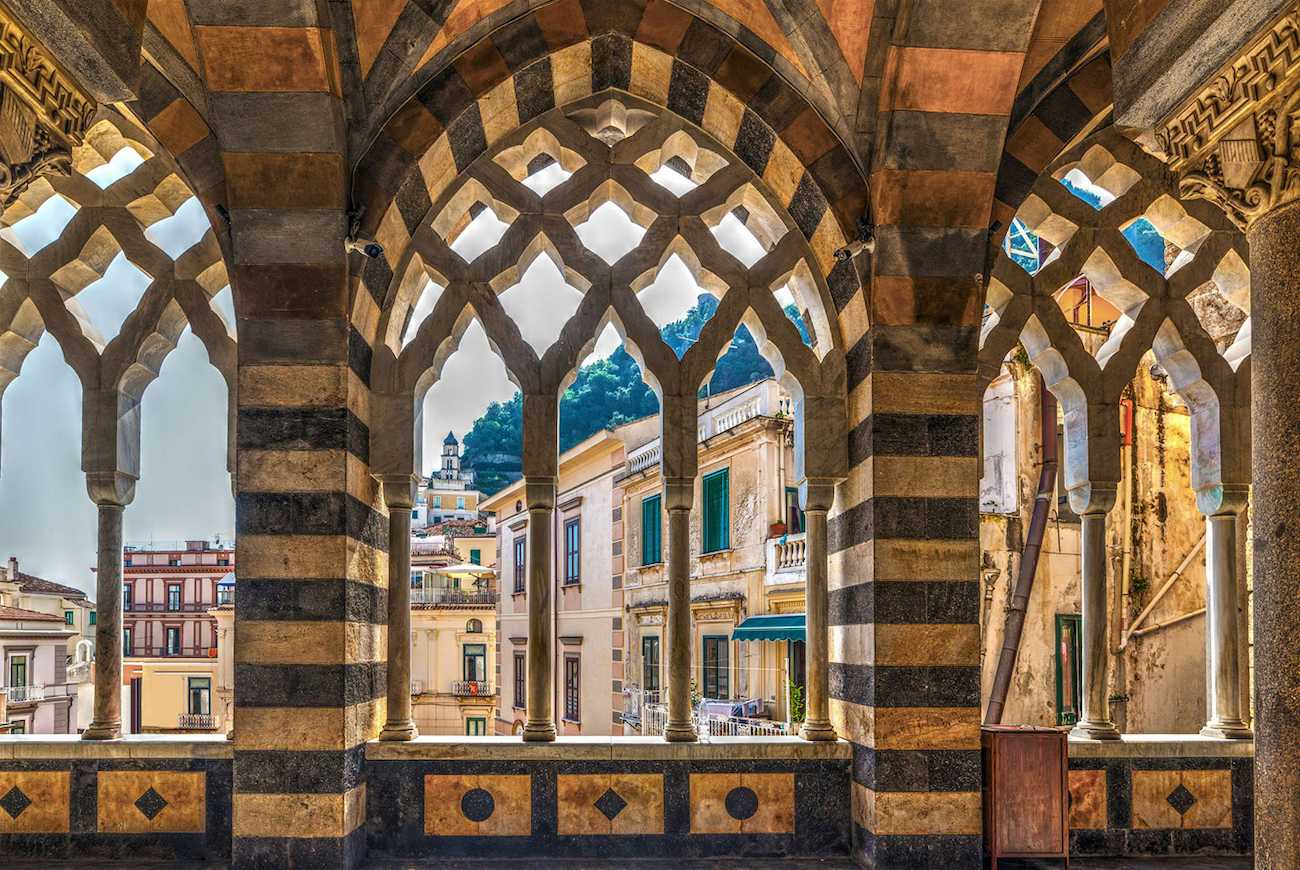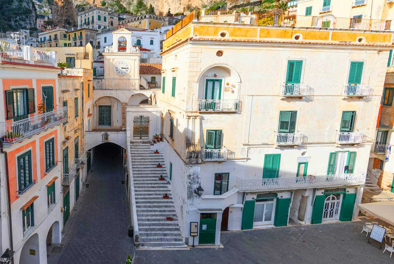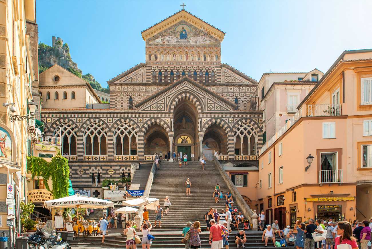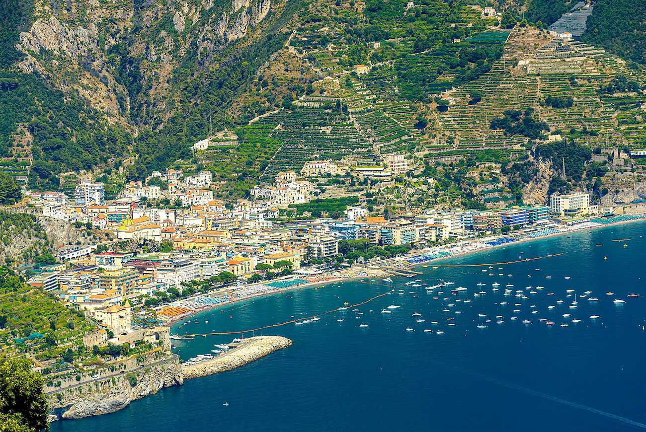 Located in a dramatic natural setting at the mouth of the Valle dei Mulini (Water Mills Valley), Amalfi is the most historic town along the coast. Between the 9th and 11th centuries it was the first of the maritime republics that included Pisa, Venice and Genoa, and had the monopoly of trade with the East, a bridge between the Byzantine and western worlds for centuries. Famous for its white houses clinging to the rock, connected to each other by covered alleys and stairways. The focal point is the Piazza del Duomo, where the striking Arab-Norman Cathedral of St. Andrew sits with the striped facade and the sixty steps leading to its entrance and is preceded by a structure with arches and decorations of Moorish influence. Inside is the beautiful highly decorated crypt and the Cloister of Paradise with a forest of columns, Arabesque arches and an amazing fresco. Amalfi is also known for the production of limoncello and, in fact, looking at the surrounding terraced hills, it is possible to see the lemon groves that produce a special variety called Sfusato Amalfitano.