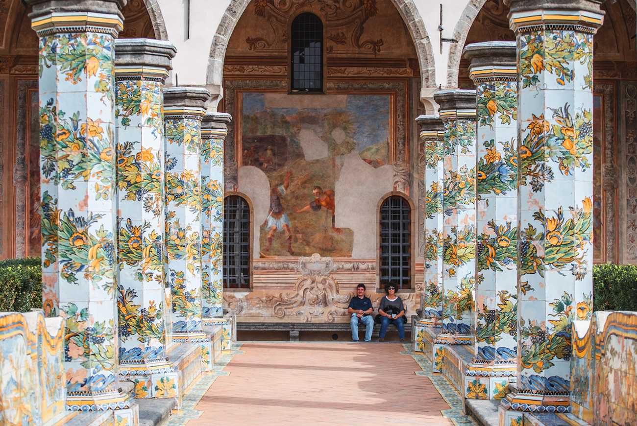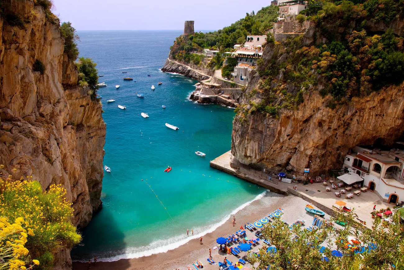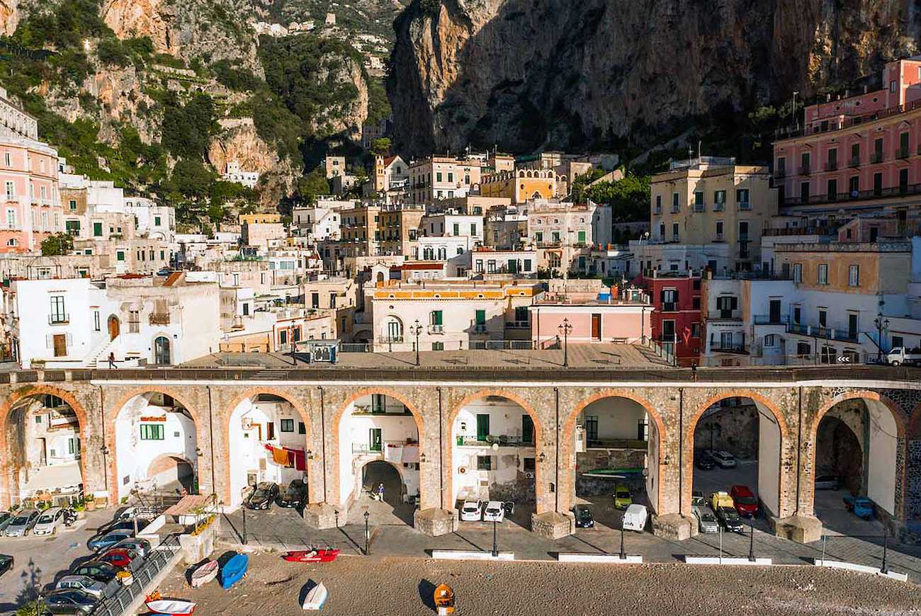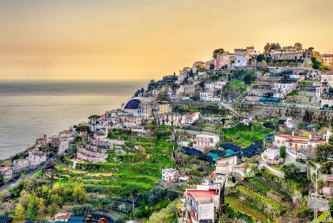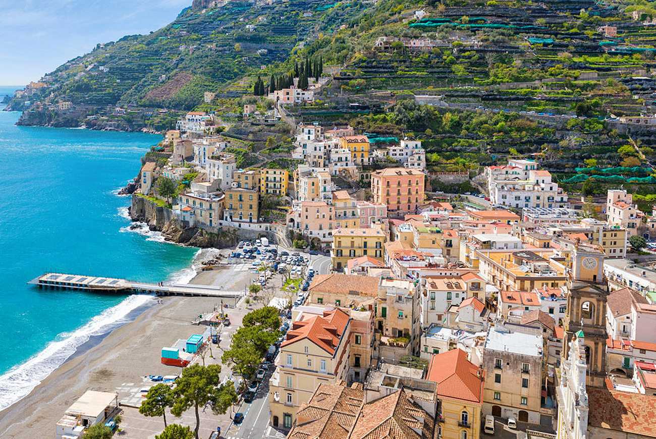 Located in a dramatic natural setting at the mouth of the Valle dei Mulini (Water Mills Valley), Amalfi is the most historic town along the coast. Between the 9th and 11th centuries it was the first of the maritime republics that included Pisa, Venice and Genoa, and had the monopoly of trade with the East, a bridge between the Byzantine and western worlds for centuries. Famous for its white houses clinging to the rock, connected to each other by covered alleys and stairways. The focal point is the Piazza del Duomo, where the striking Arab-Norman Cathedral of St. Andrew sits with the striped facade and the sixty steps leading to its entrance and is preceded by a structure with arches and decorations of Moorish influence. Inside is the beautiful highly decorated crypt and the Cloister of Paradise with a forest of columns, Arabesque arches and an amazing fresco. Amalfi is also known for the production of limoncello and, in fact, looking at the surrounding terraced hills, it is possible to see the lemon groves that produce a special variety called Sfusato Amalfitano.