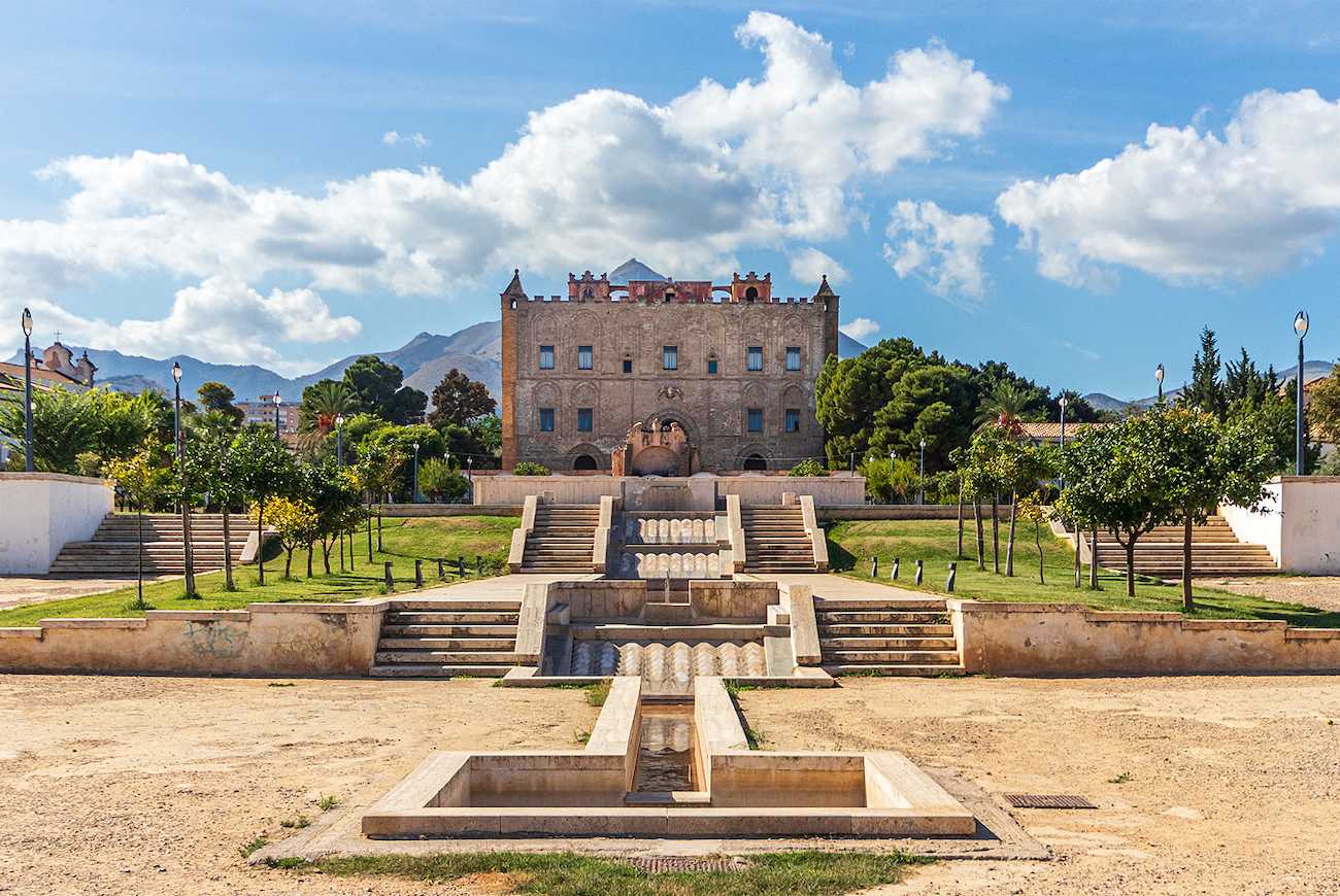 The Norman King’s Summer Retreat. The Zisa Palace, from the Arabic al-Aziz (the glorious, the splendid), is clearly inspired by Moorish architecture and a good example of palatial architecture. Construction began in the 12th century by Arabian craftsmen for king William I of Sicily, and completed by his son William II. Located outside the walls of the ancient city of Palermo, it was the most important and representative monument of the large hunting resort known as the Genoardo from the Arabic Jannat al-ar (garden or paradise of the earth). At the center of the ground floor is the Sala della fontana (fountain hall), an Islamic-style iwan hall. The whole room is decorated with marble inlays and a rare panel of Byzantine mosaics.