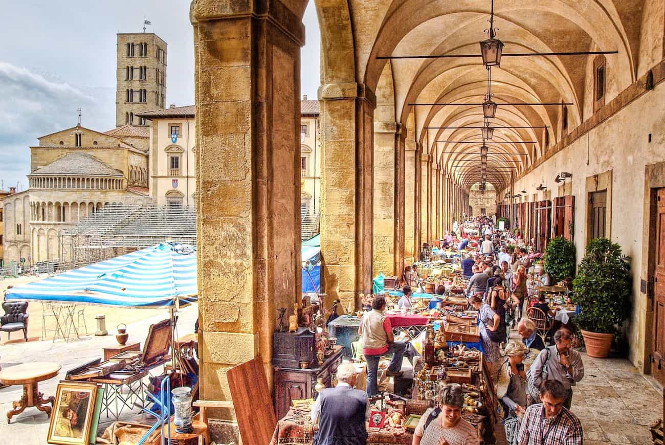 Arezzo is the Cinderella of Tuscany, unjustly overshadowed by the fame of Florence, Siena and Pisa. The beautiful historic center conveys the wealth it has gathered over the past centuries. Lying on a steep hill, which rises from the floodplain of the Arno, the river that crosses Florence and Pisa, Arezzo (Aritim in Etruscan), which was born around the 9th century BC, was one of the twelve most important Etruscan cities. Conquered by the Romans in 311 BC, due to its strategic position, it became a military station on the Via Cassia, the road through which Rome expanded in the North. After the Gothic war and the invasion of the Lombards at the end of the 6th century, only the amphitheater survived from the Roman period. Arezzo was home to important and great artists such as Petrarch, the pioneer poet of Renaissance literature and humanist thought; the painter Piero della Francesca whose masterpiece painting can be seen in the Church of San Francesco; Vasari, architect and painter and the painters Masaccio, Michelangelo and Luca Signorelli. Arezzo has a lot to offer; palaces, small alleys and quiet streets, archaeological sites, churches, monuments, museums and beautiful squares such as Piazza Grande where some scenes of the film Life is beautiful by Roberto Benigni were filmed. Arezzo hosts two major events, the medieval festival The Giostra del Saracino, held twice during summer, and the largest Antiques Fair in Italy, held on the first weekend of each month.