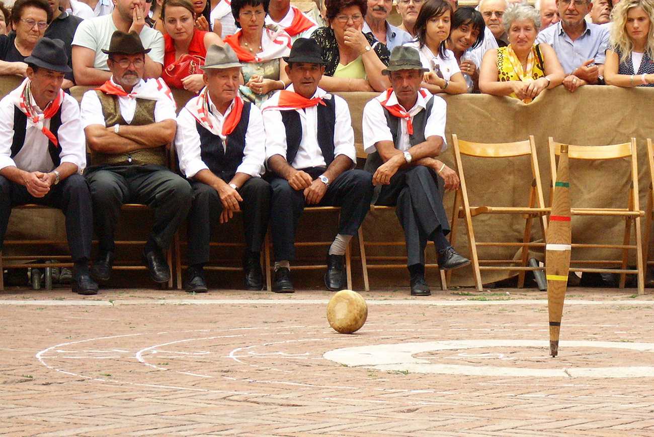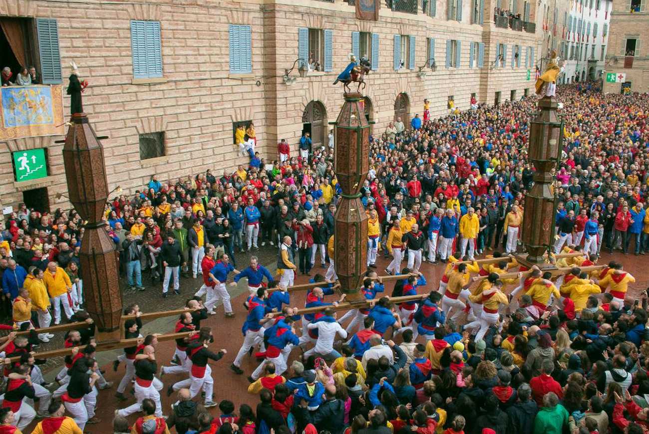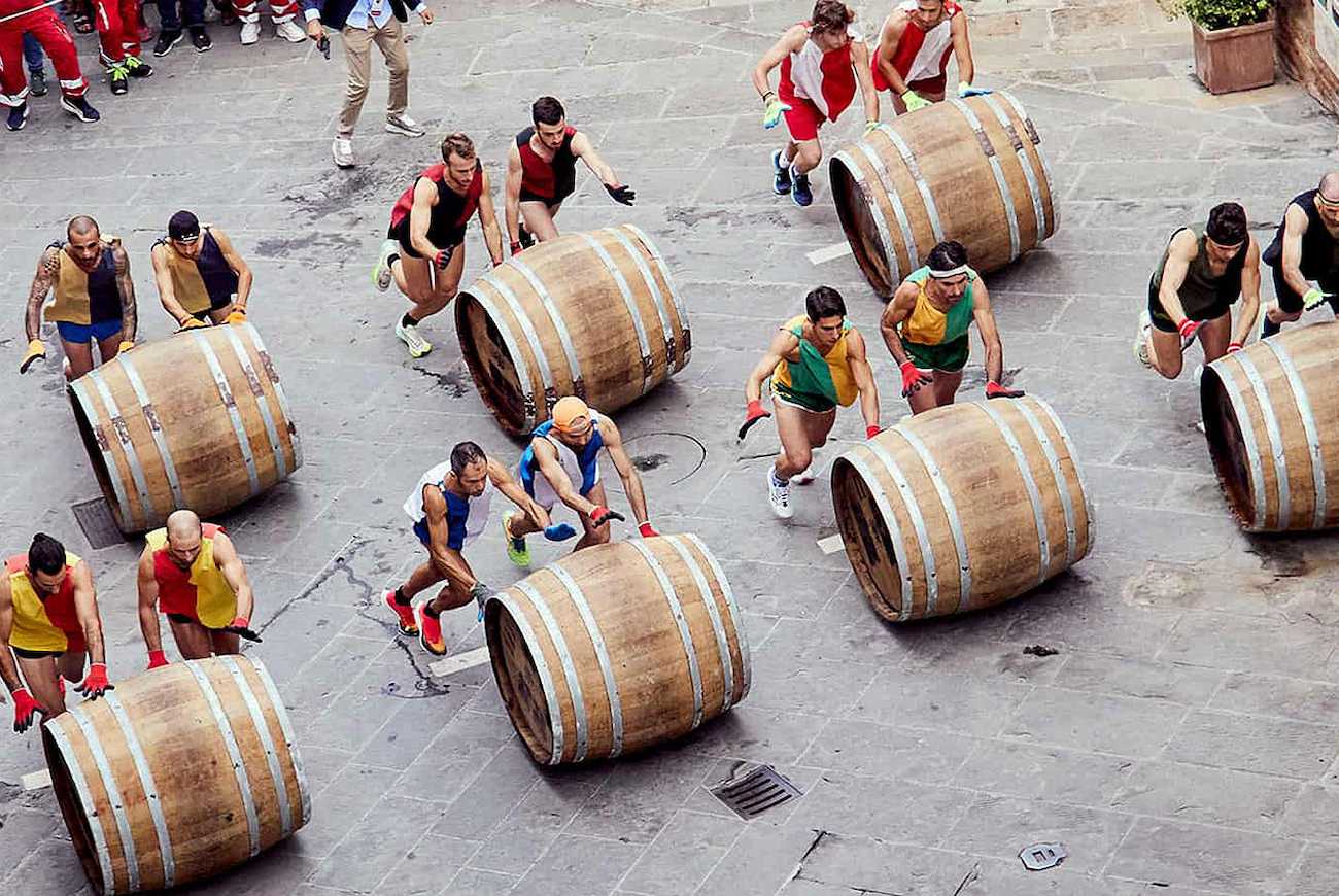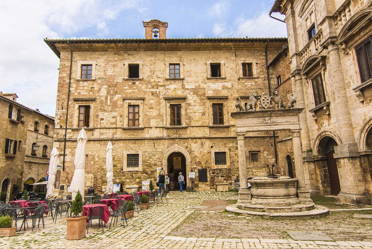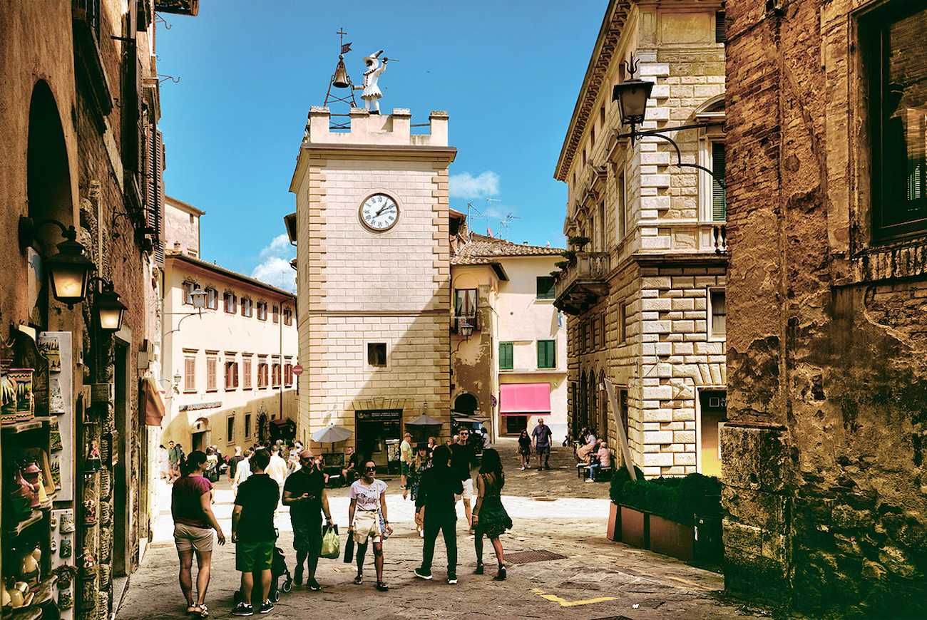 Montepulciano has a long and ancient history that begins in the 4th century BC, reaching its cultural and economic splendor in the 16th century. Montepulciano is known throughout the world for its magnificent Vino Nobile di Montepulciano DOCG, one of the best wines in the world, the result of centuries of viticulture dating back to Etruscan times. From the historic center of the city, which still adheres to its medieval plan, filled with splendid Renaissance palaces, churches, monuments, charming squares and hidden corners, you can admire the impressive vineyards of the surrounding valleys that remind us of its agricultural importance. The Torre di Pulcinella is a clock tower topped by a figure of the Pulcinella, a commedia dell’arte character. The heart of Montepulciano is Piazza Grande and the setting for its main events, including the barrel-racing Bravio delle Botti contest held in August every year since 1974, replacing an equivalent horserace dating back to 1373. Teams of two spingitori (pushers/runners) representing the eight contrade (town’s districts) compete to be the first to roll an 80 kg wine barrel through the streets of the historic center for approximately 1.8 km (1.1 mi) mostly uphill. Due to the narrow streets and the barrels' shape and size, collisions between teams are frequent. The word bravio derives from the latin Bravium meaning victory prize, which in this case is a painted cloth bearing the image of the patron saint of the city.