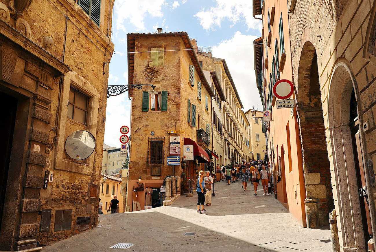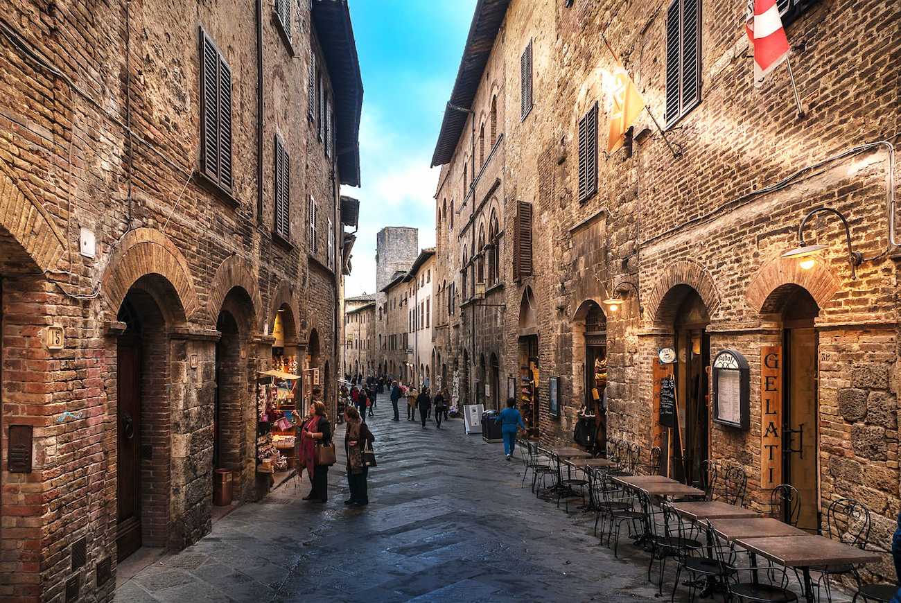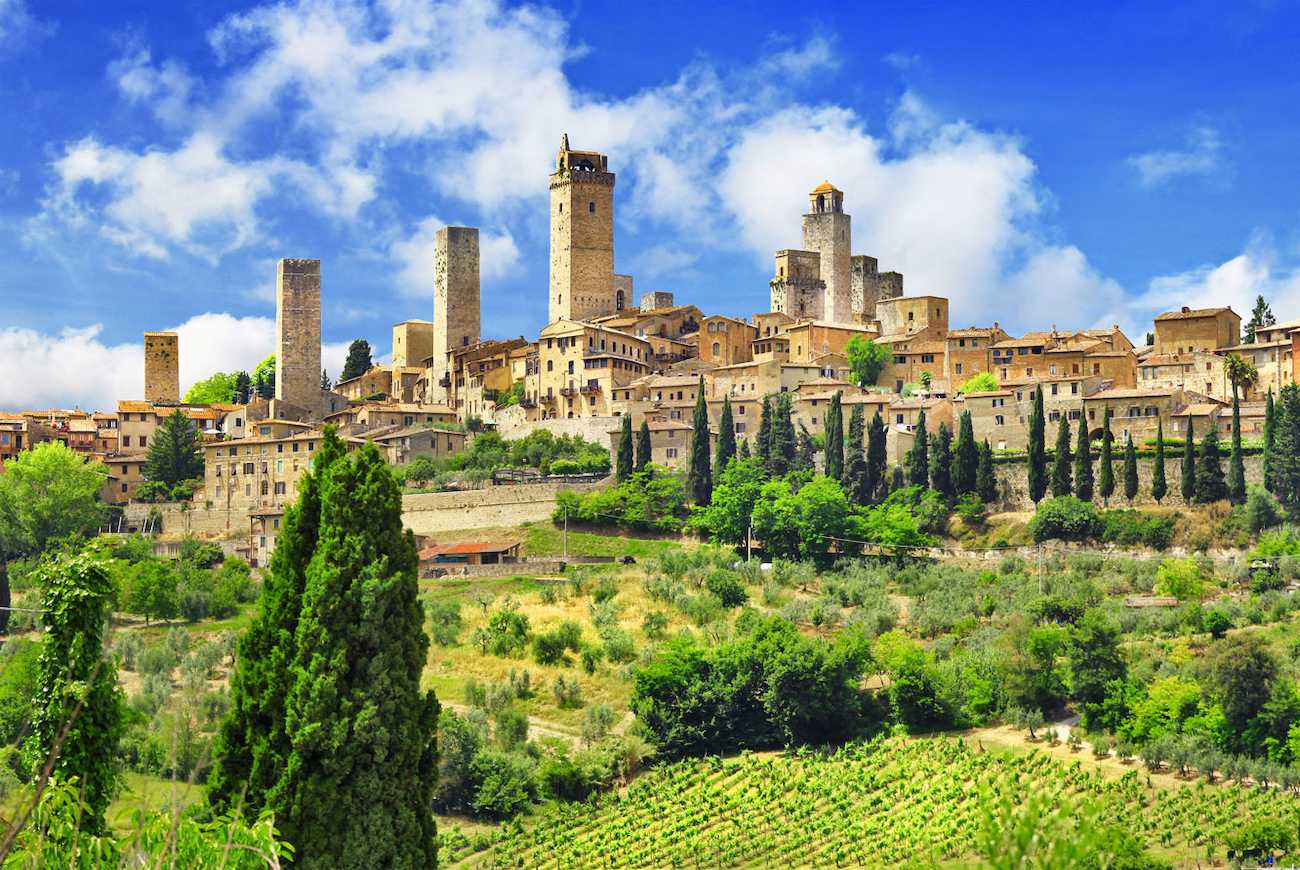 As with many other Tuscan cities, the history of San Gimignano dates back to the archaic Etruscan period, but it was during the Middle Ages that the city flourished when well off merchants and aristocrats built towers to show their wealth and power. A walk in the San Gimignano’s Old City, inside the 13th century walls, offers a glimpse of its past glory with 13 towers still standing out of the approximately 72 originally built. The old town grew around two centers: Piazza della Cisterna, a triangular square lined with medieval houses and a lovely well in the middle, and Piazza Duomo, with its more intricate shape where the majority of public and private buildings are located. San Gimignano, in the High Middle Ages, served as an important relay point for pilgrims traveling to or from Rome on the Via Francigena, an ancient trail starting in Canterbury, England, and ending in Rome. San Gimignano offers many local products, like saffron, extra virgin olive oil, salami and the renowned white wine, the Vernaccia di San Gimignano.