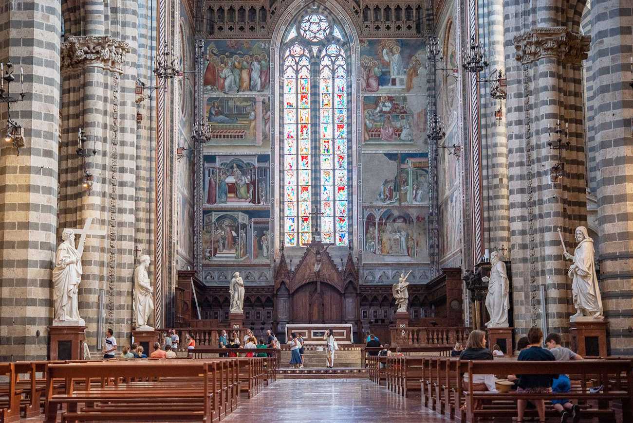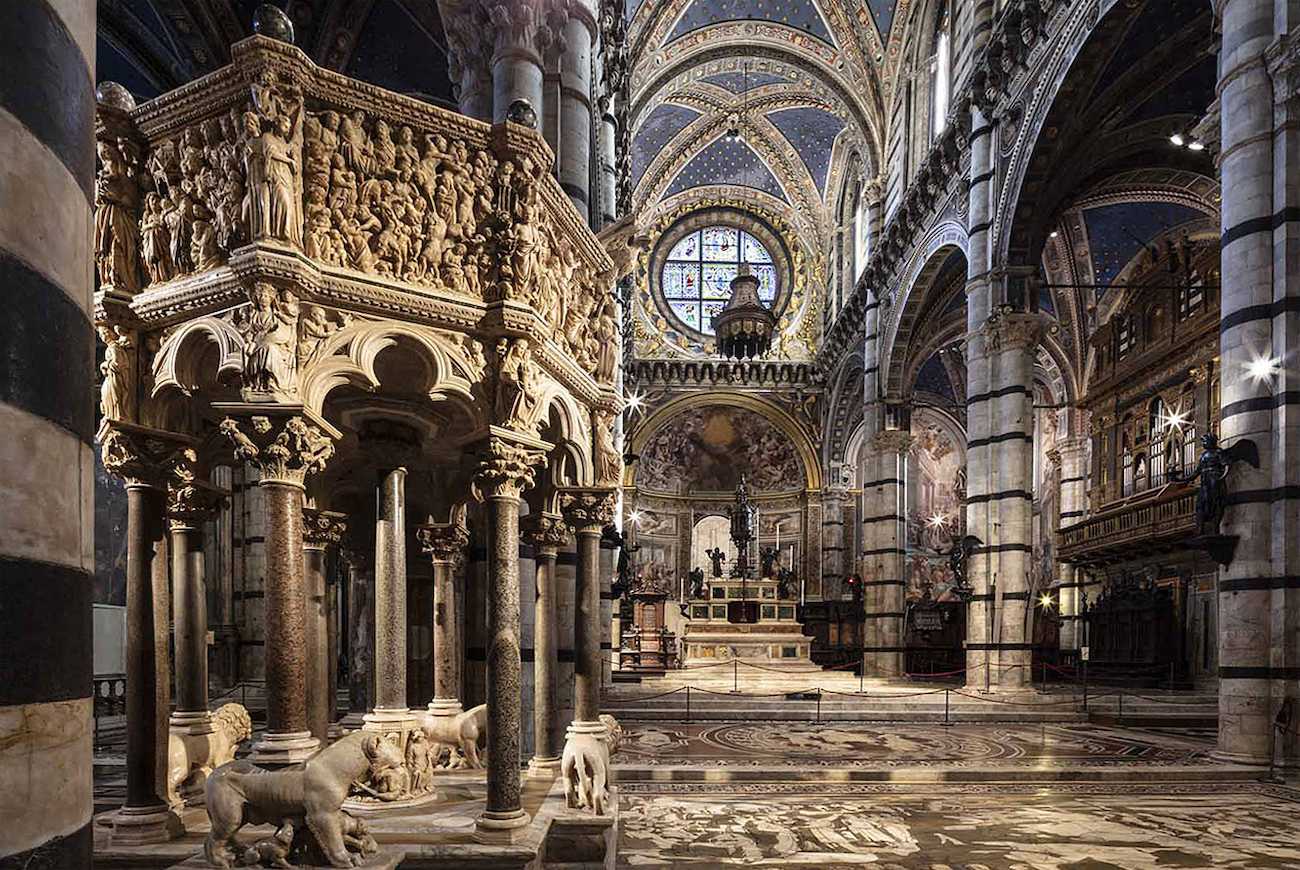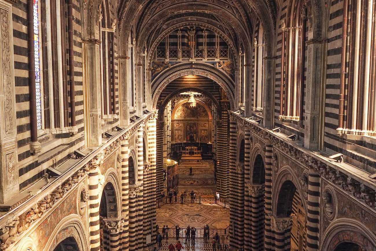 The Duomo, the cathedral dedicated to the Assumption of Mary, was designed and completed between 1215 and 1264. The exterior and interior are constructed of white and black marble in alternating stripes, with the addition of red marble on the façade. The Cathedral is a unique example of perfect synergy between elements of Gothic, Romanesque, and Classical architecture. The façade is one of the most fascinating in all of Italy. All the interior elements; the columns, the arches, the ornate golden dome, the frescoes and the spectacular inlaid marble mosaic flooring, full of esoteric symbols and religious stories, are a feast for the eyes. Many valuable pieces of art include The Feast of Herod by Donatello, and works by Bernini and the young Michelangelo.