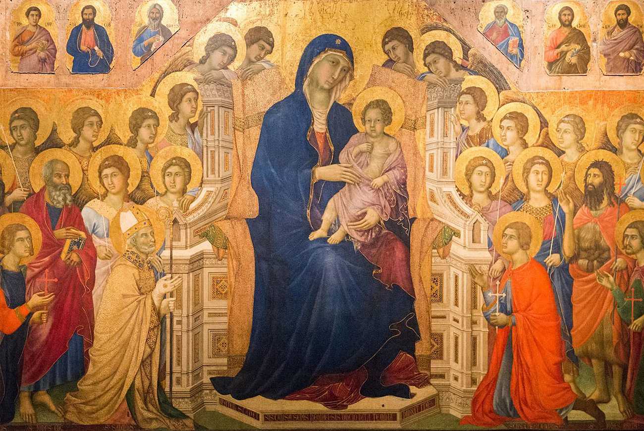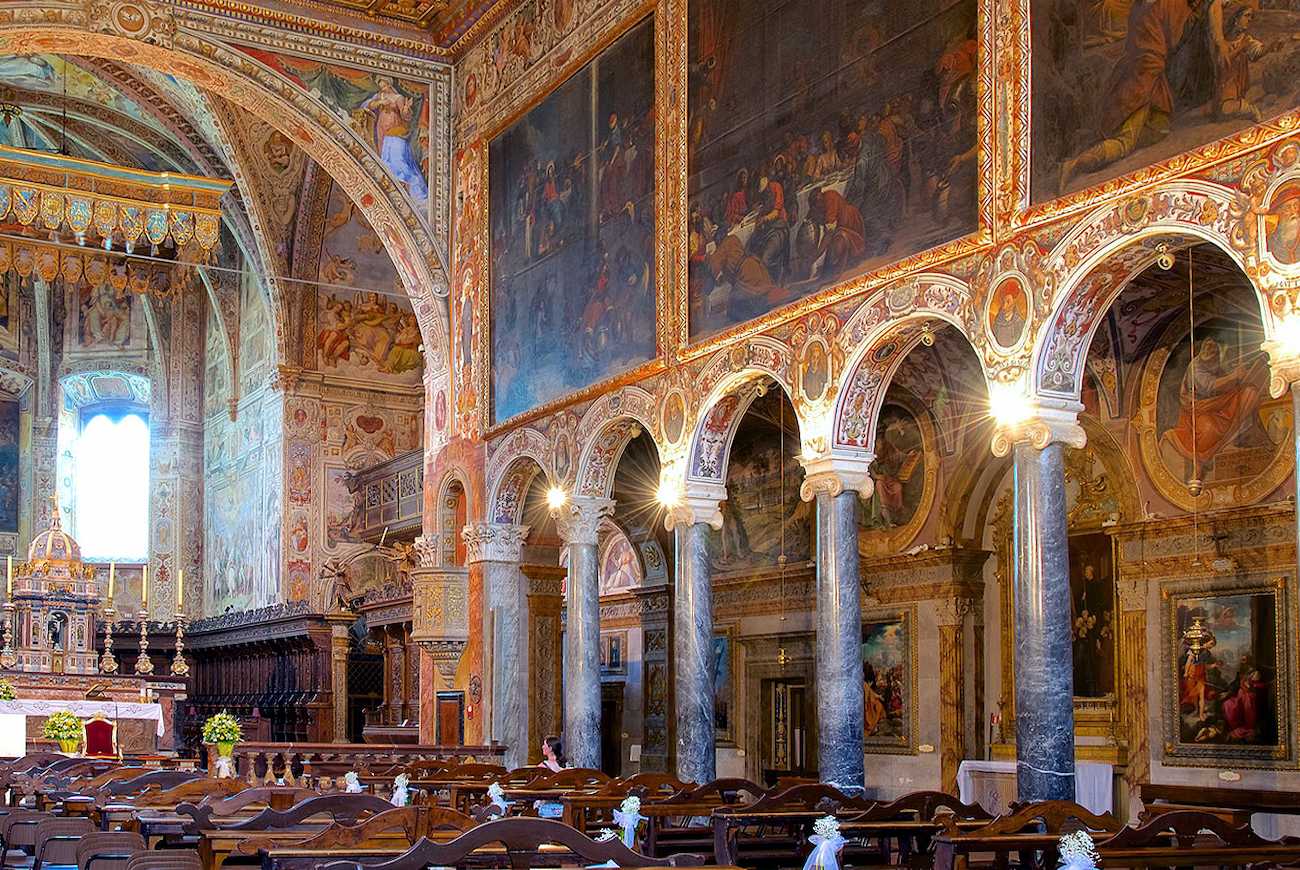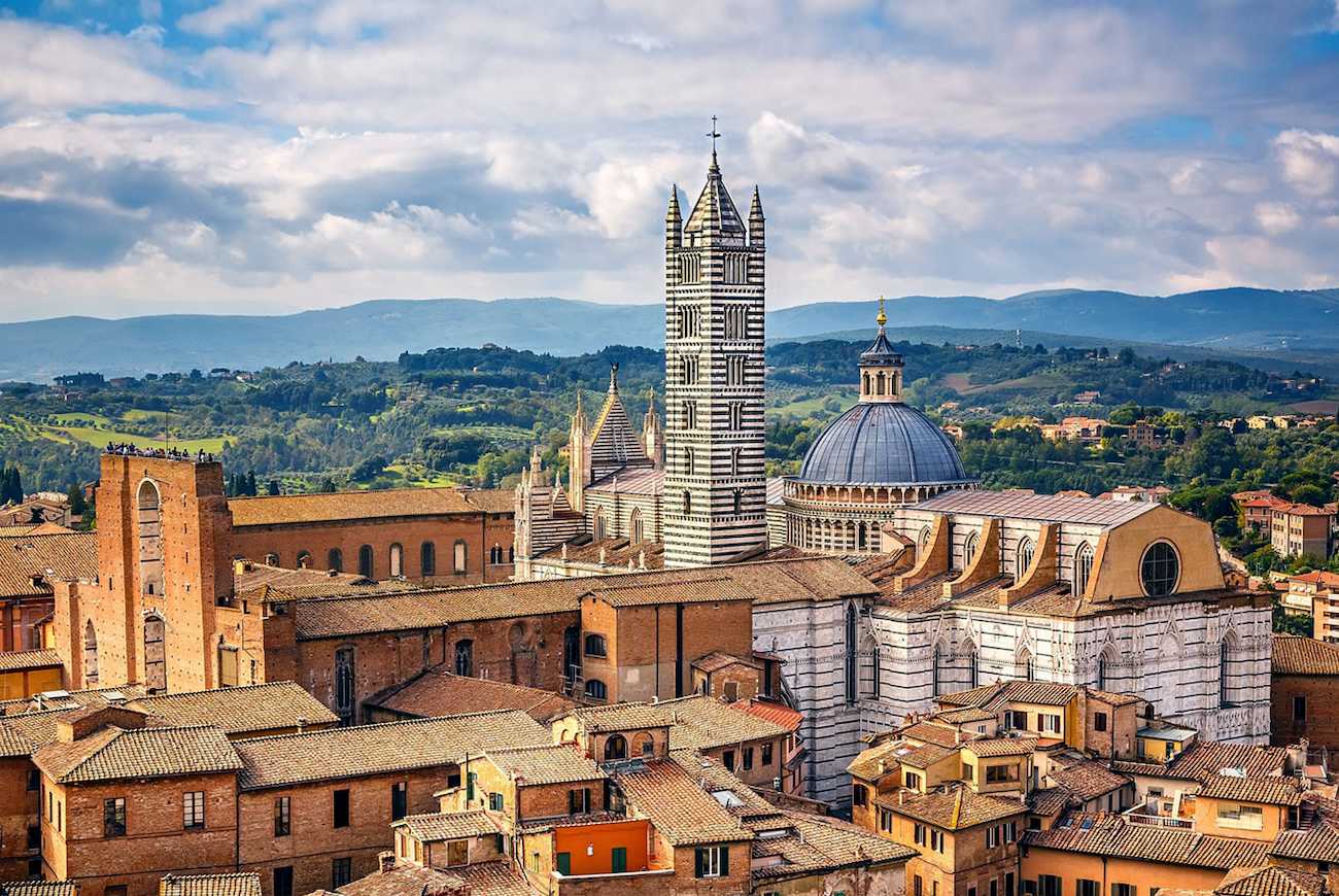 The Duomo, the cathedral dedicated to the Assumption of Mary, was designed and completed between 1215 and 1264. The exterior and interior are constructed of white and black marble in alternating stripes, with the addition of red marble on the façade. The Cathedral is a unique example of perfect synergy between elements of Gothic, Romanesque, and Classical architecture. The façade is one of the most fascinating in all of Italy. All the interior elements; the columns, the arches, the ornate golden dome, the frescoes and the spectacular inlaid marble mosaic flooring, full of esoteric symbols and religious stories, are a feast for the eyes. Many valuable pieces of art include The Feast of Herod by Donatello, and works by Bernini and the young Michelangelo.