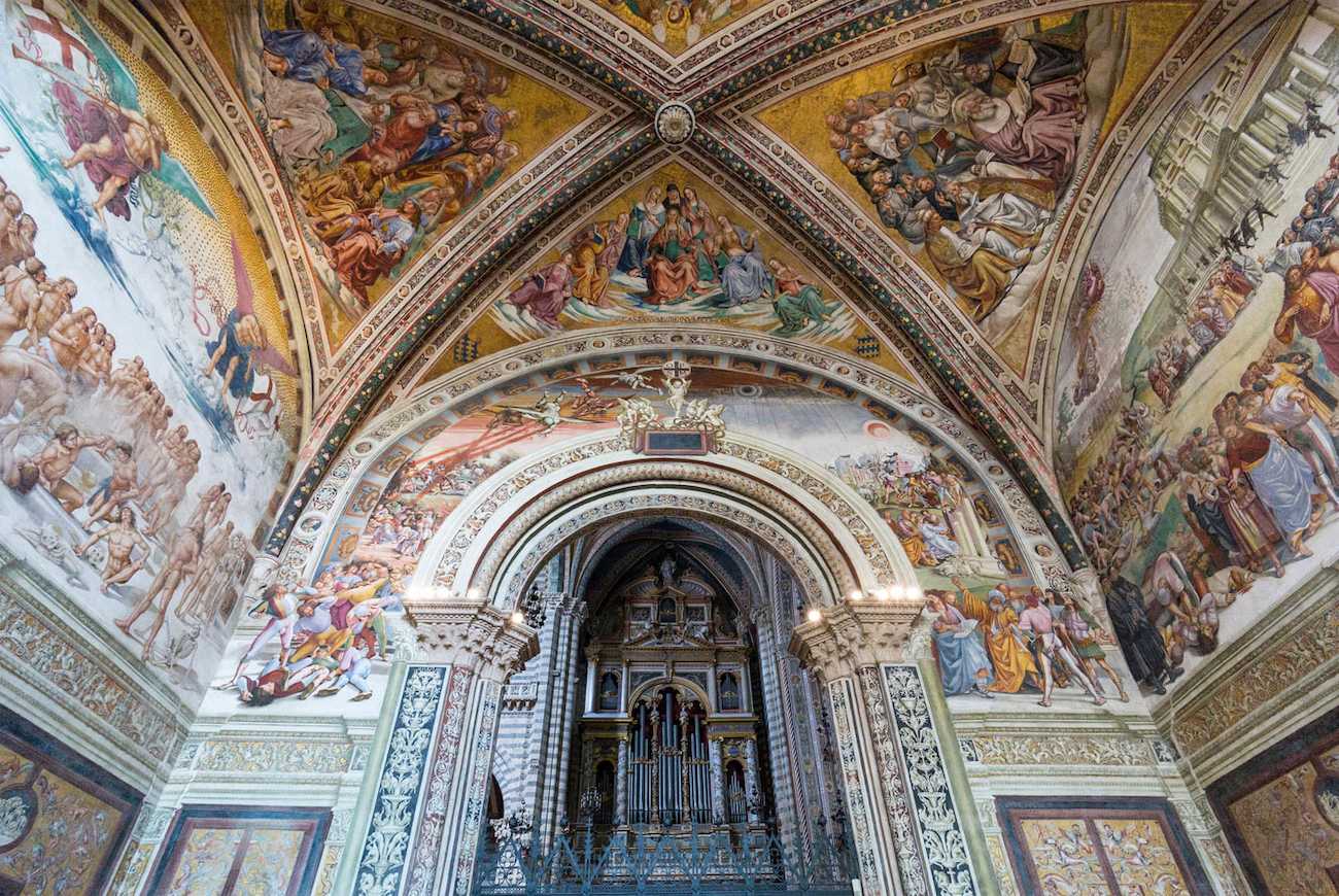 The Gothic Cathedral is one of the most famous in Italy. Construction of the cathedral began in 1290, initially using a design by the architect of the Florence Cathedral, and lasted for nearly three centuries, with the design and style evolving from Romanesque to Gothic. The façade, in richly polychrome sculpted marble, bas-relief decorations and statues, is one of the great masterpieces of the Late Middle Ages. The painters Fra Angelico and Benozzo Gozzoli decorated sections of the vault in the Chapel of the Madonna di San Brizio, a 15th century addition to the cathedral, while the decoration of the rest of the vault and of the lunettes is by Luca Signorelli, completed in 1503. These frescoes, on the Apocalypse and the Last Judgment, are considered Signorelli’s most complex and impressive work.