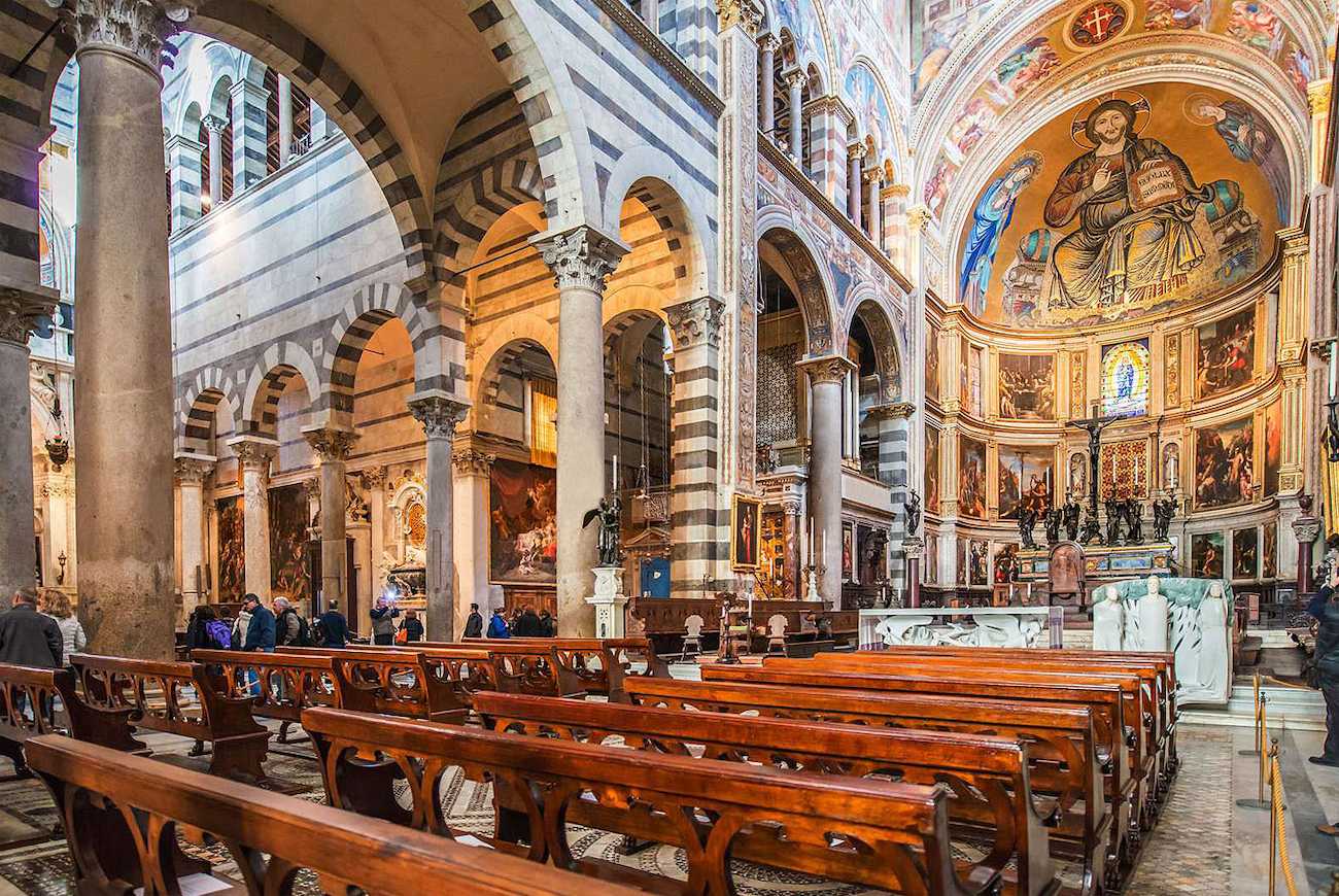 The Cathedral was built thanks to the wealth accumulated during the wars that the Pisans fought together with the Normans to free the city of Palermo from the Arabs. It was built inside a river port on the banks of what was once the Auser river, outside the early medieval walls to symbolize the power of the city which did not fear external threats. The construction began in 1063 but the Cathedral was consecrated only 50 years later when it was completed with the splendid façade. It is decorated with several styles: Lombard-Emilian, Classical, Byzantine and Romanesque. Inside are of particular note the ceiling decorated with 17th century gilded coffers, the 68 monolithic columns which represented the number of churches in Pisa at the time. The Arab influence in the interior, with the use of raised arches, the alternation of black and white marble bands and the unusual elliptical dome, all of Moorish inspiration, made the cathedral the first of its kind in Europe at the time.