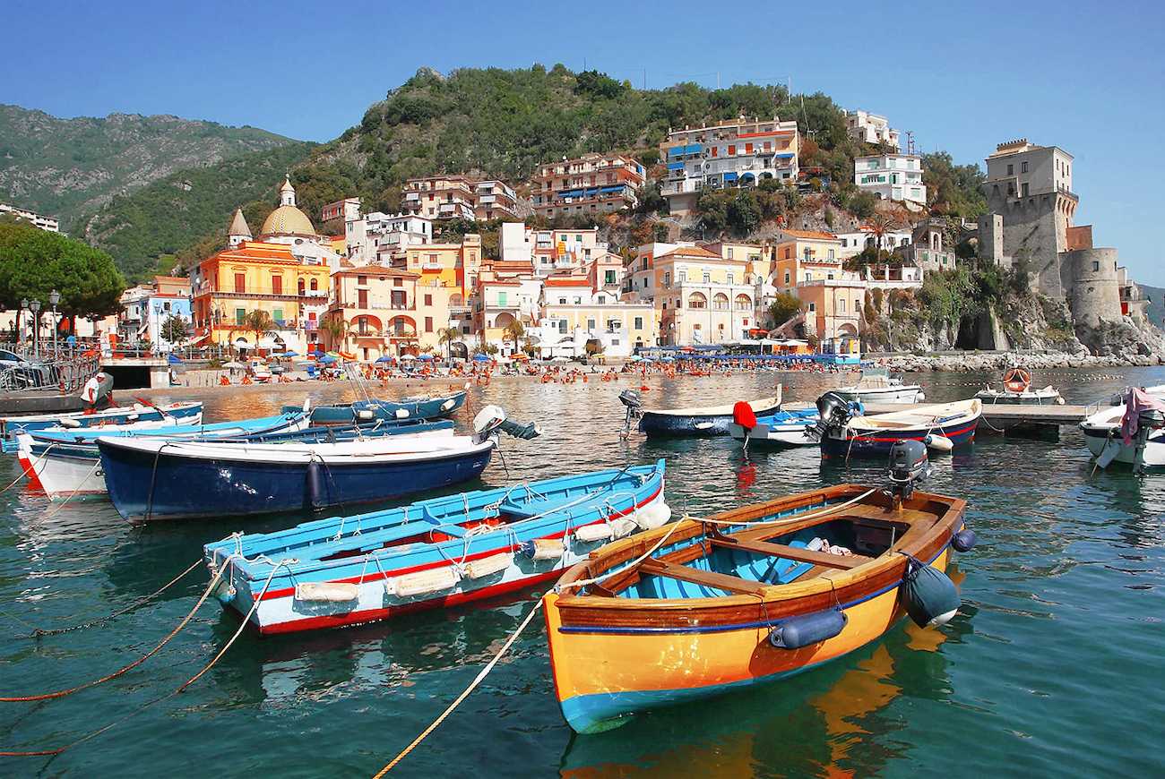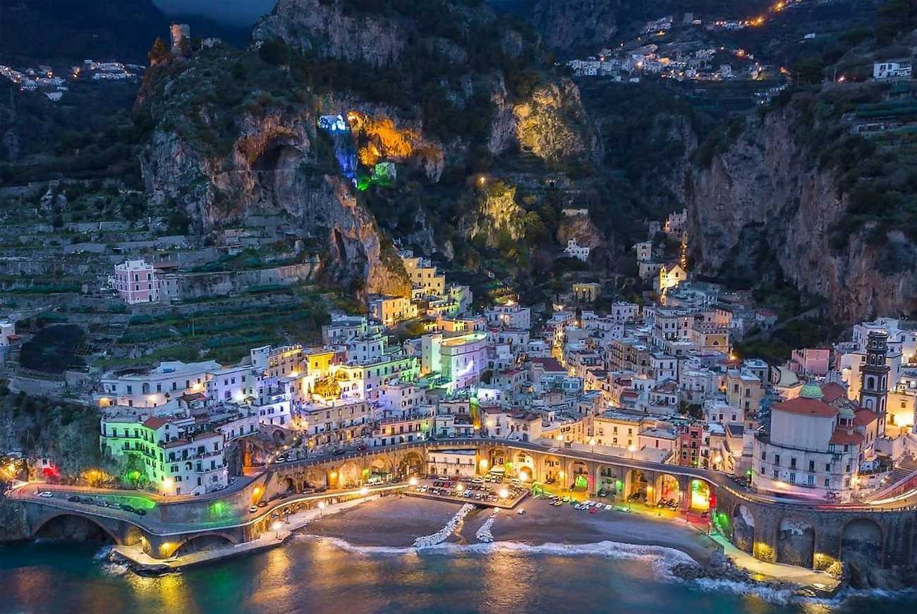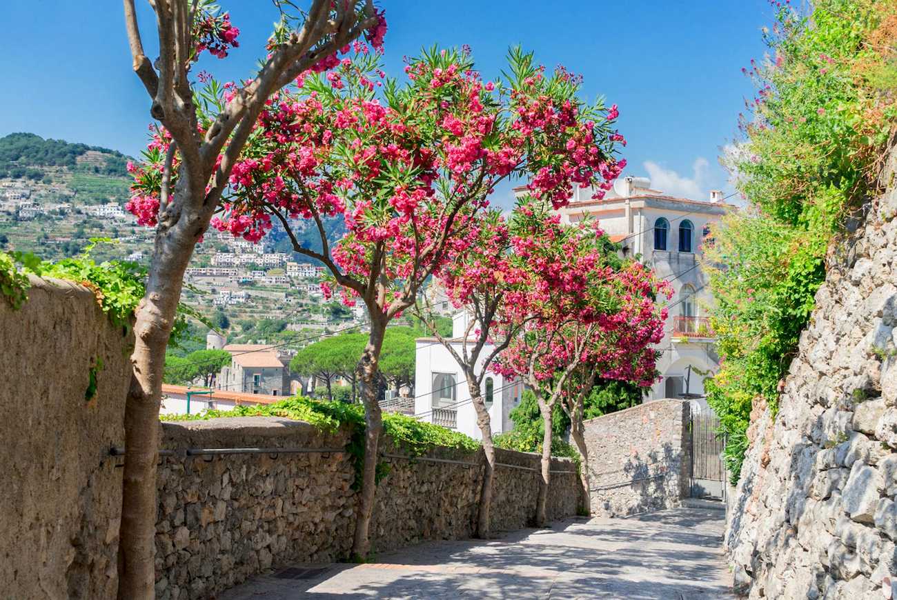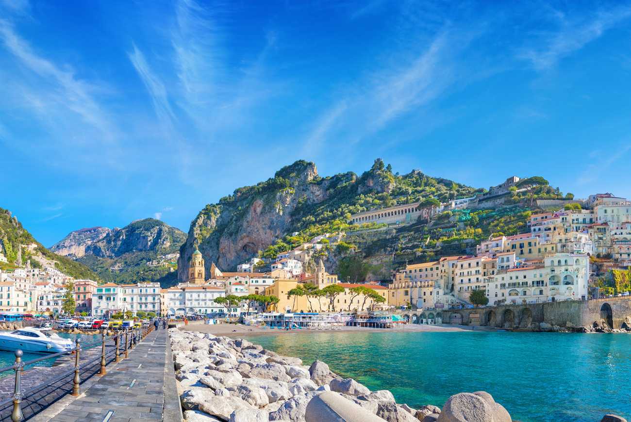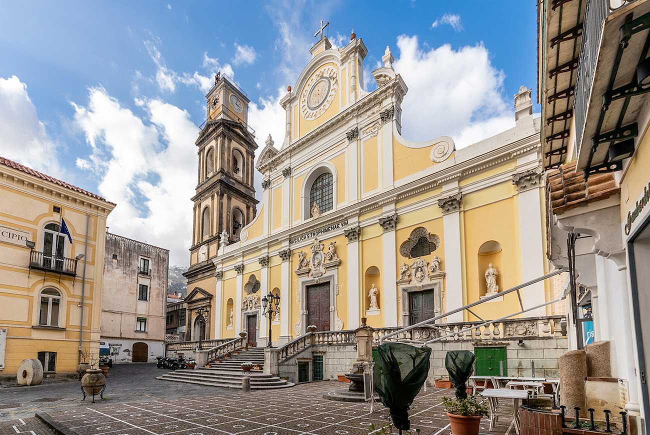 Located in a dramatic natural setting at the mouth of the Valle dei Mulini (Water Mills Valley), Amalfi is the most historic town along the coast. Between the 9th and 11th centuries it was the first of the maritime republics that included Pisa, Venice and Genoa, and had the monopoly of trade with the East, a bridge between the Byzantine and western worlds for centuries. Famous for its white houses clinging to the rock, connected to each other by covered alleys and stairways. The focal point is the Piazza del Duomo, where the striking Arab-Norman Cathedral of St. Andrew sits with the striped facade and the sixty steps leading to its entrance and is preceded by a structure with arches and decorations of Moorish influence. Inside is the beautiful highly decorated crypt and the Cloister of Paradise with a forest of columns, Arabesque arches and an amazing fresco. Amalfi is also known for the production of limoncello and, in fact, looking at the surrounding terraced hills, it is possible to see the lemon groves that produce a special variety called Sfusato Amalfitano.