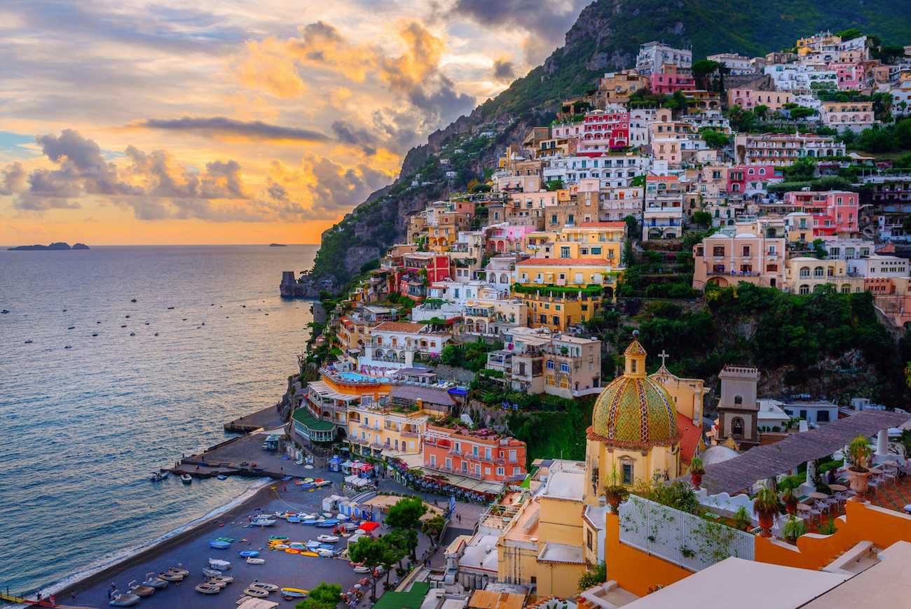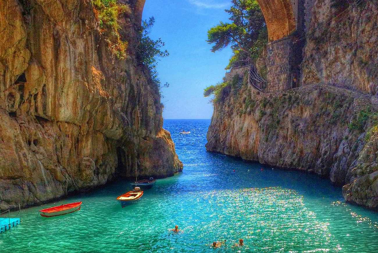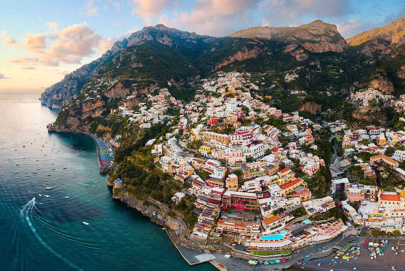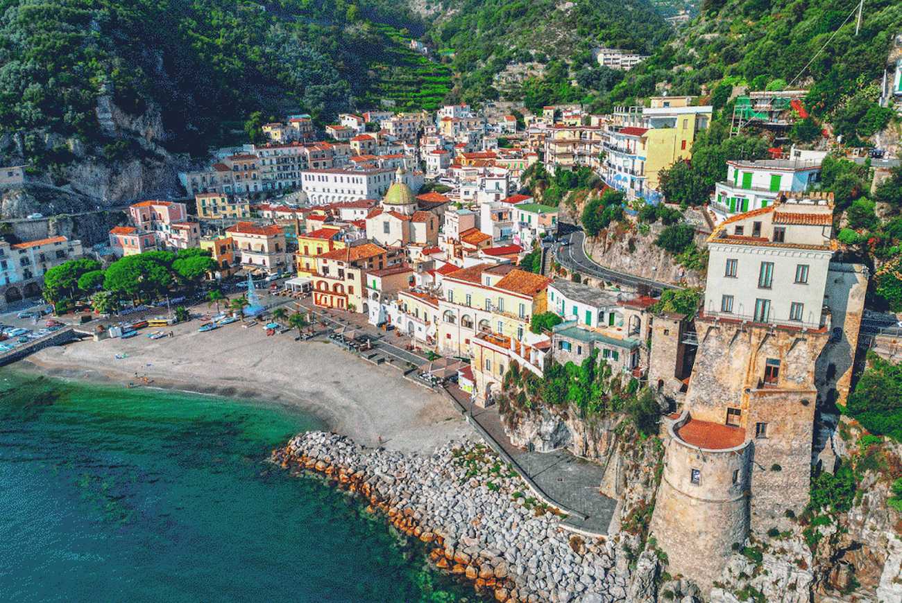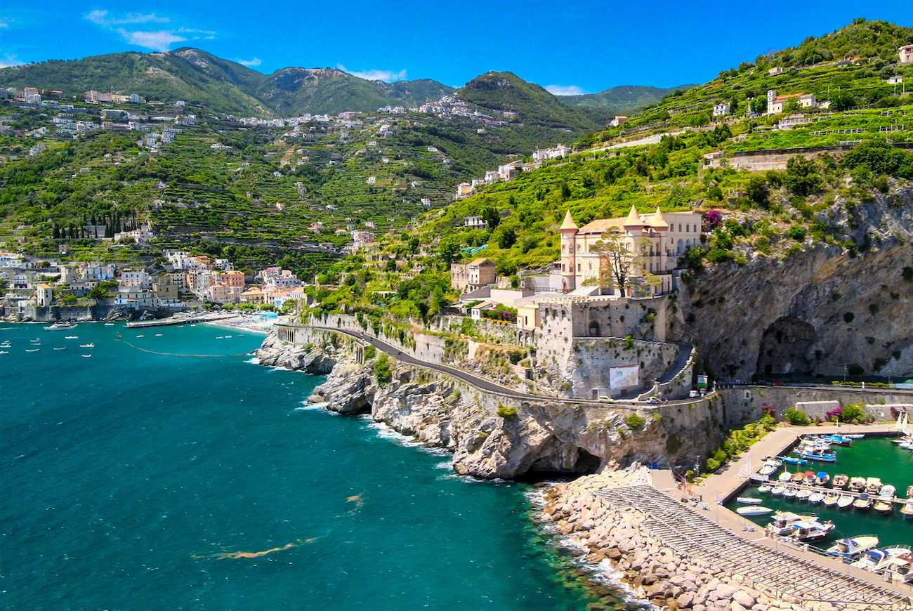 The Amalfi Coast is a stretch of coastline, about 40 km (25 mi) of winding road, overlooking the Tyrrhenian Sea and the Gulf of Salerno. It’s named after the town of Amalfi, which makes up its main historical and political center. The two extreme cities are Vietri sul Mare and Positano. With its spectacular landscapes and idyllic climate it has been a tourist destination since Roman times. Jagged cliffs, adorned with pastel-colored fishing villages, plunge dramatically towards crystalline turquoise waters, lapping at the shores of hidden coves. Breathtaking historic houses cling precariously to the cliff sides, while the surrounding mountains are terraced with verdant vineyards and fragrant lemon groves – the source of some of Italy's finest limoncello.
