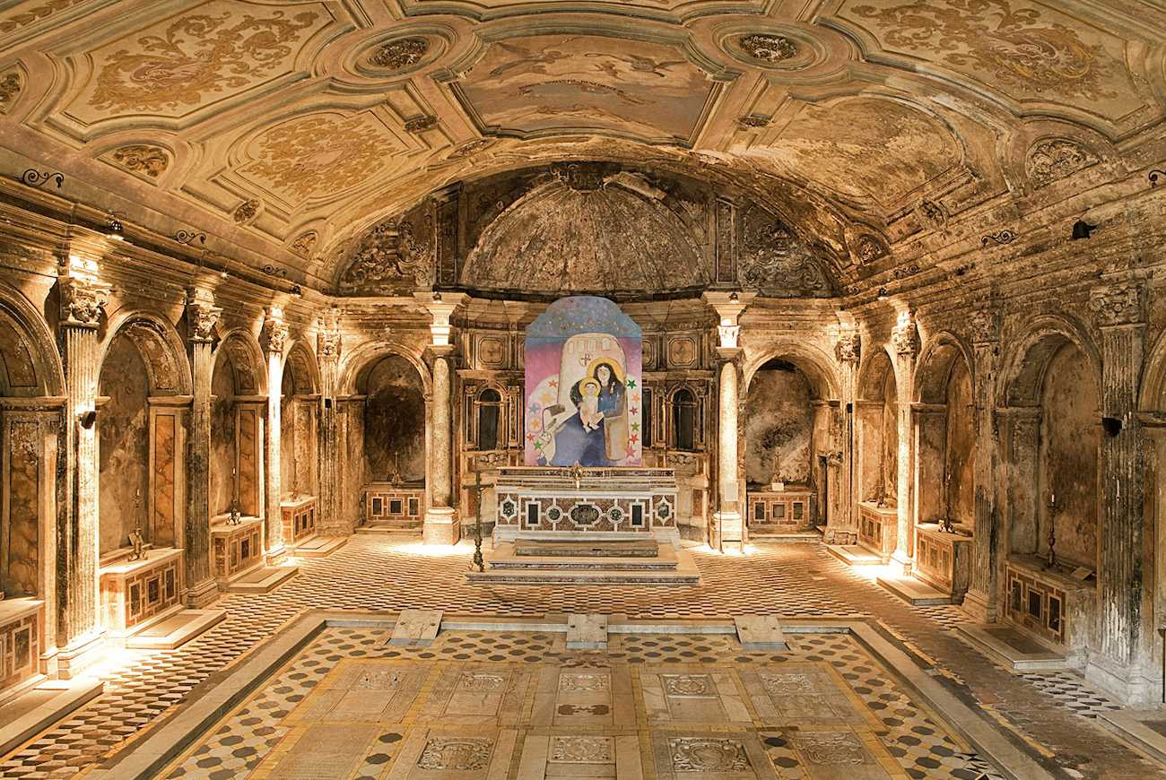 The chapel is a splendid example of Arab-Norman art located inside the Norman Palace. The amazing interior is covered in glittering 12th century Norman-Byzantine mosaics, with an extraordinary depth and vividness achieved by gold-backed tesserae and silver mosaic tiles. The interior is capped by a 10th century Arab honeycomb stalactite wooden ceiling. The ceiling imagery is painted with biblical scenes as well as scenes of Arab and Norman court life, full of symbols and allegories. The texts in the chapel are written in Latin, Greek and Arabic, exemplifying the social-cultural syncretism between Western, Byzantine and Islamic cultures in Sicily.