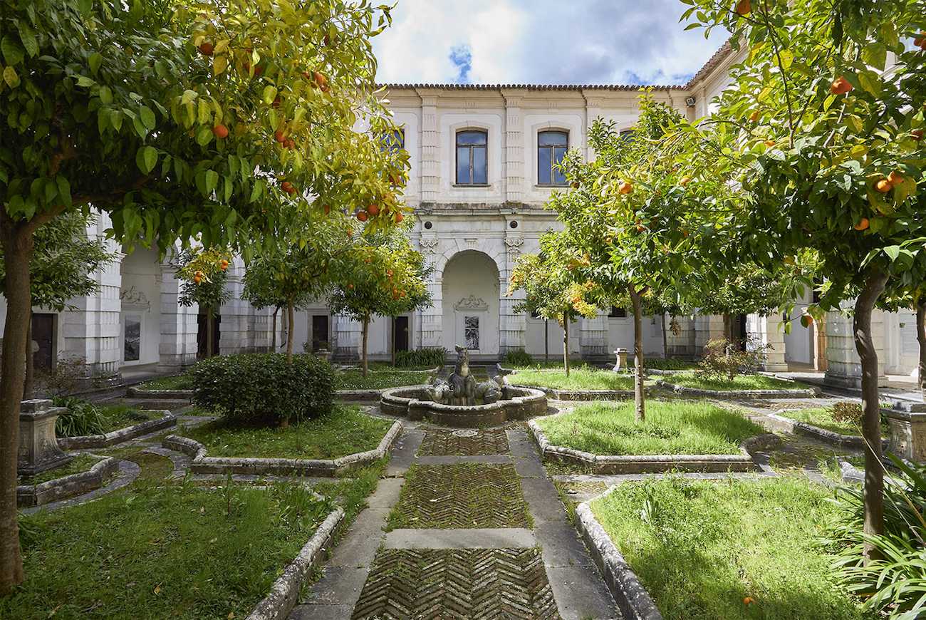 The splendid cloister of Monreale delights the eyes and spirit, a masterpiece of sculpture and inlaid precious stones. The cloister has a square shape with pointed arches supported on 228 white marble columns, richly decorated with figure carvings and mosaic work, with patterns in gold and colorful glass tesserae. The unique capitals, there is not one identical to the other, are carved with biblical scenes, allegories and foliage. At one angle of the cloister is an Arabesque marble fountain designed by Islamic artists.