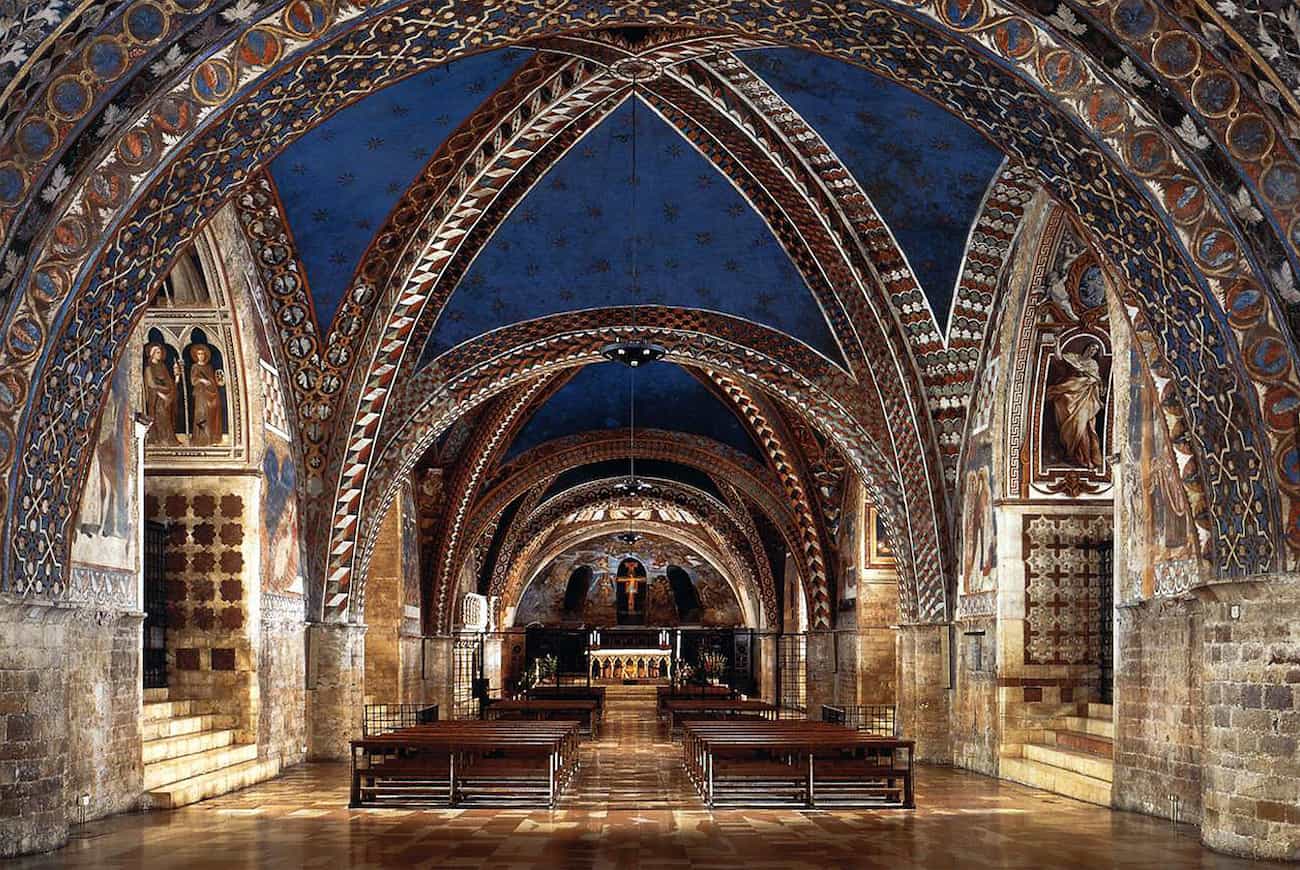 The city’s most notable landmark is the Basilica of Saint Francis. Its construction began in 1228, just two years after the saint’s death, and was completed in 1253. The two-story basilica consists of the upper church and the lower one that contains the crypt where St. Francis is buried. The basilica is one of the largest repositories of early Renaissance frescoes in Italy. The upper church has frescoes depicting episodes from the life of Saint Francis by Giotto, and other frescoes depicting scenes from the Old and New Testaments by Cimabue and Jacopo Torriti. The earthquake of September 26, 1997 severely damaged the basilica, collapsing several vaults of the upper church and destroying frescoes by Cimabue and others.