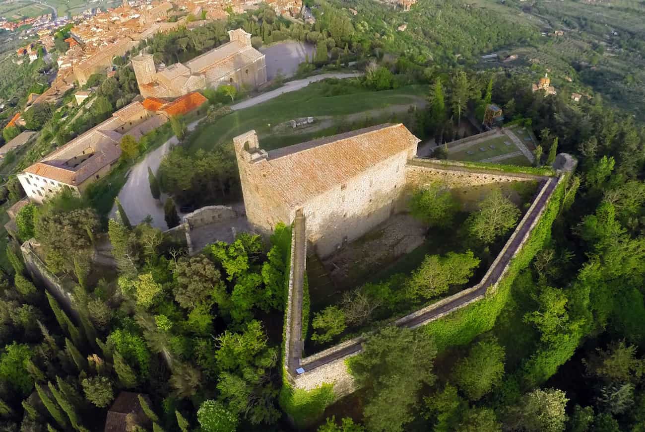 The Lion Fortress, built around 1247 on the orders of Emperor Frederick II of Swabia, sits on the remains of an Etruscan acropolis. The irregular pentagon-shaped plan is composed of a 39 m (128 ft) high triangular tower and four towers that fortify the crenelated walls; two of these, of circular shape, were built in the first half of the 16th century. Inside the Rocca are the ruins of a church of probably Byzantine origin, built on the remains of an Etruscan temple. The Rocca has been adapted as an amphitheater for cinema, musical performances and events of various kinds.