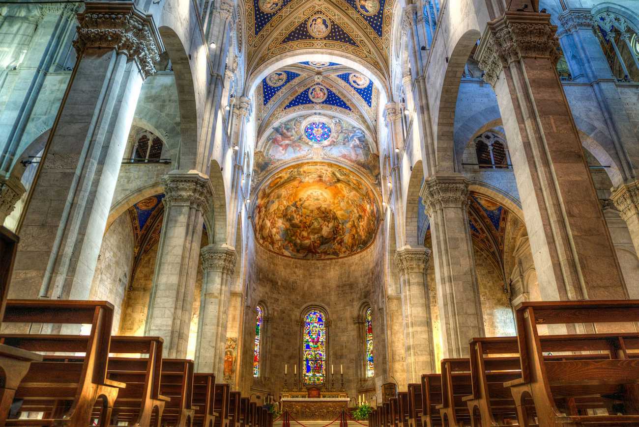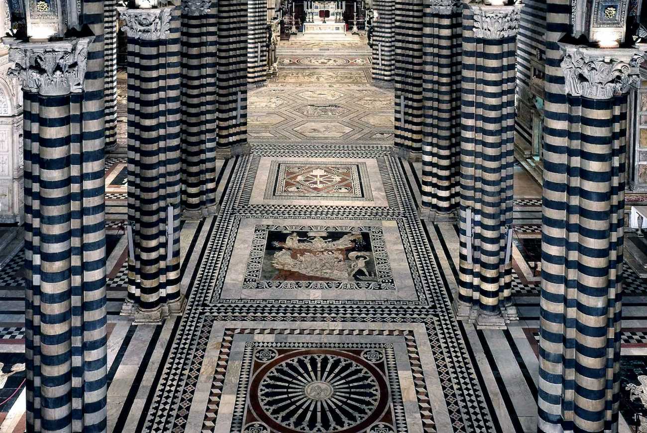 The Duomo, the cathedral dedicated to the Assumption of Mary, was designed and completed between 1215 and 1264. The exterior and interior are constructed of white and black marble in alternating stripes, with the addition of red marble on the façade. The Cathedral is a unique example of perfect synergy between elements of Gothic, Romanesque, and Classical architecture. The façade is one of the most fascinating in all of Italy. All the interior elements; the columns, the arches, the ornate golden dome, the frescoes and the spectacular inlaid marble mosaic flooring, full of esoteric symbols and religious stories, are a feast for the eyes. Many valuable pieces of art include The Feast of Herod by Donatello, and works by Bernini and the young Michelangelo.