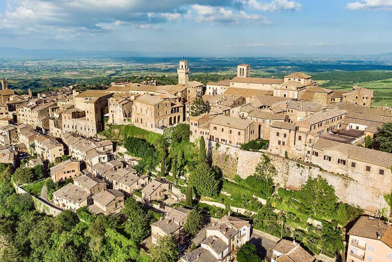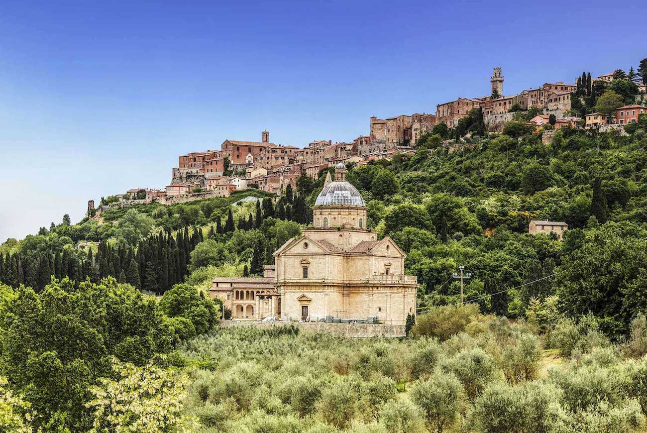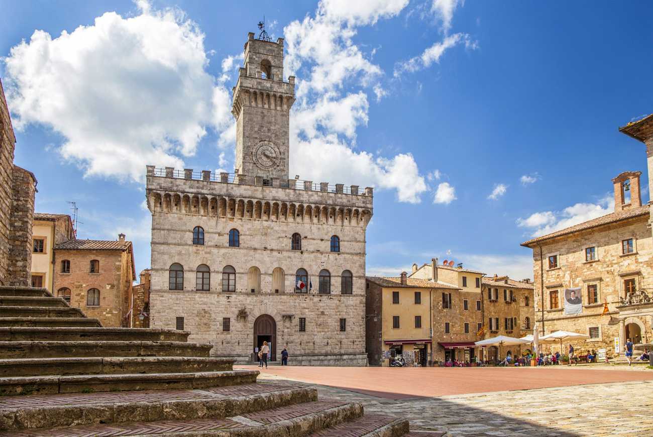 Montepulciano has a long and ancient history that begins in the 4th century BC, reaching its cultural and economic splendor in the 16th century. Montepulciano is known throughout the world for its magnificent Vino Nobile di Montepulciano DOCG, one of the best wines in the world, the result of centuries of viticulture dating back to Etruscan times. From the historic center of the city, which still adheres to its medieval plan, filled with splendid Renaissance palaces, churches, monuments, charming squares and hidden corners, you can admire the impressive vineyards of the surrounding valleys that remind us of its agricultural importance. The Torre di Pulcinella is a clock tower topped by a figure of the Pulcinella, a commedia dell’arte character. The heart of Montepulciano is Piazza Grande and the setting for its main events, including the barrel-racing Bravio delle Botti contest held in August every year since 1974, replacing an equivalent horserace dating back to 1373. Teams of two spingitori (pushers/runners) representing the eight contrade (town’s districts) compete to be the first to roll an 80 kg wine barrel through the streets of the historic center for approximately 1.8 km (1.1 mi) mostly uphill. Due to the narrow streets and the barrels' shape and size, collisions between teams are frequent. The word bravio derives from the latin Bravium meaning victory prize, which in this case is a painted cloth bearing the image of the patron saint of the city.