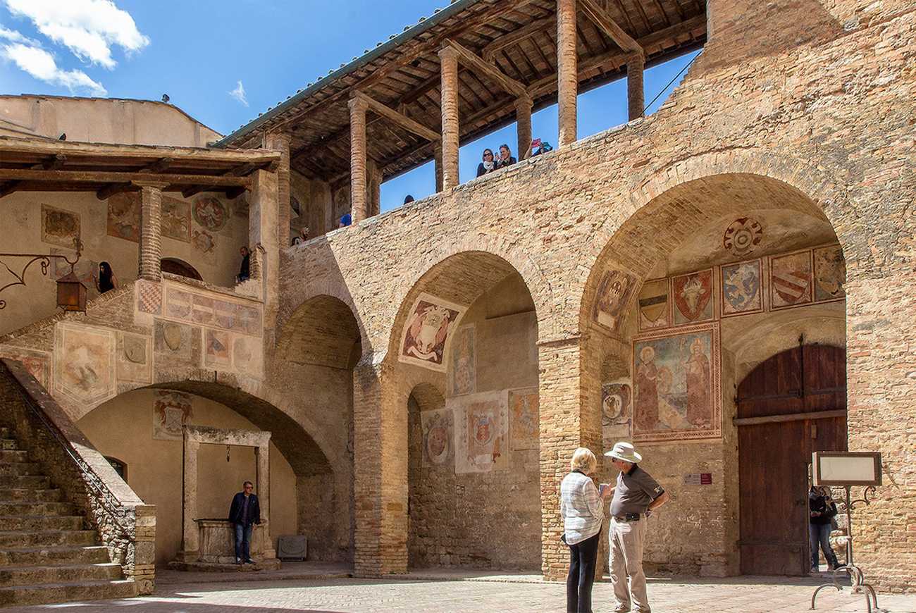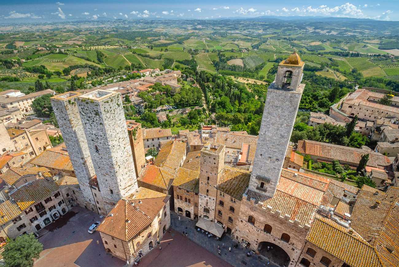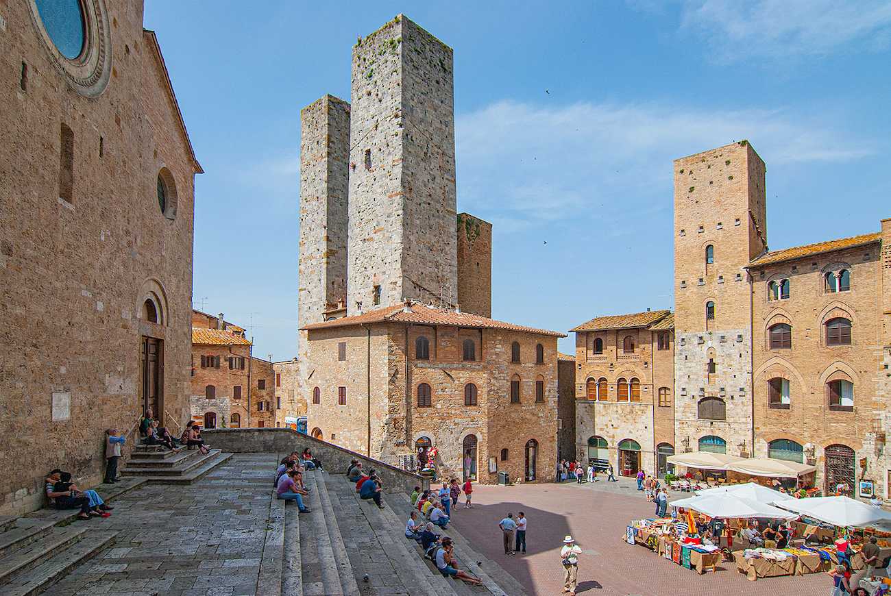 As with many other Tuscan cities, the history of San Gimignano dates back to the archaic Etruscan period, but it was during the Middle Ages that the city flourished when well off merchants and aristocrats built towers to show their wealth and power. A walk in the San Gimignano’s Old City, inside the 13th century walls, offers a glimpse of its past glory with 13 towers still standing out of the approximately 72 originally built. The old town grew around two centers: Piazza della Cisterna, a triangular square lined with medieval houses and a lovely well in the middle, and Piazza Duomo, with its more intricate shape where the majority of public and private buildings are located. San Gimignano, in the High Middle Ages, served as an important relay point for pilgrims traveling to or from Rome on the Via Francigena, an ancient trail starting in Canterbury, England, and ending in Rome. San Gimignano offers many local products, like saffron, extra virgin olive oil, salami and the renowned white wine, the Vernaccia di San Gimignano.